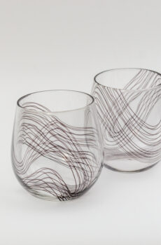 Encalmo Bowl with silver blue top section with cane squiggles and an amethyst purple bottom section. About a 7 inch diameter at the lip. Perfect personal or small serving bowl